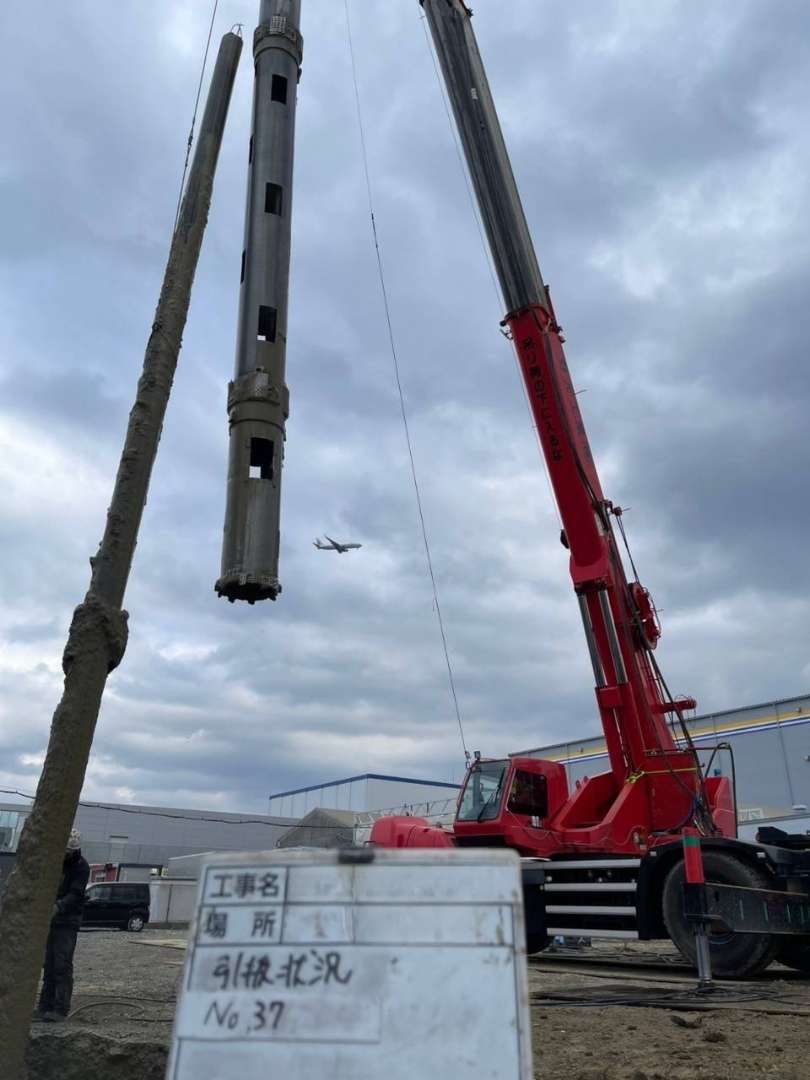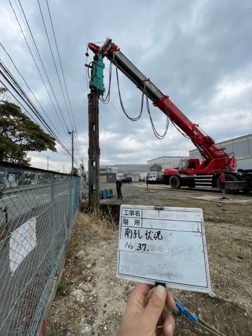 M物流倉庫の解体に伴い、既存杭の引き抜き工事を行いました。対象となる杭は異なる径(∅300〜∅400mm)かつ長さ16mのものが44本にのぼり、地中深くにまで達する大規模な杭撤去が求められる現場でした。